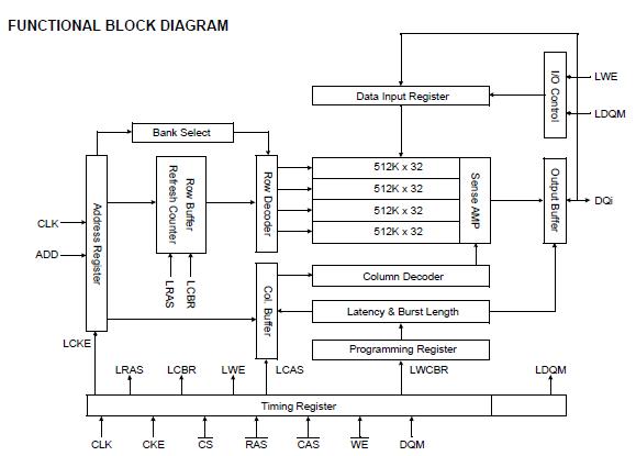 Features: (1)3.3V power supply; (2)LVTTL compatible with multiplexed address; (3)Four banks operation; (4)All inputs are sampled at the positive going edge of the system; (5)clock; (6)Burst read single-bit write operation; (7)DQM for masking; (8)Auto & self refresh; (9)15.6us refresh duty cycle.