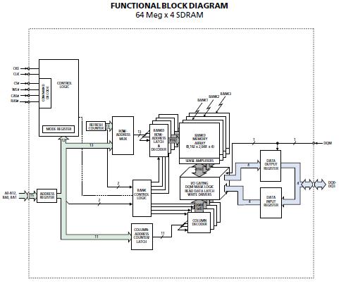 Features: (1)Fully synchronous; all signals registered on positive edge of system clock; (2)Internal pipelined operation; column address can be changed every clock cycle; (3)Internal banks for hiding row access/precharge; (4)Programmable burst lengths: 1, 2, 4, 8, or full page.