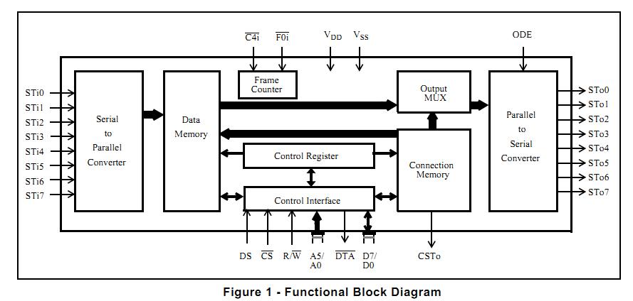 The MT8980DPR1 is a VLSI ISO-CMOS device. It is designed for switching PCM-encoded voice or data, under microprocessor control, in a modern digital exchange, PBX or Central Office. The MT8980DPR1 provides simultaneous connections for up to 256 64 kbit/s channels. Each of the eight serial inputs and outputs consist of 32 64 kbit/s channels multiplexed to form a 2048 kbit/s ST-BUS stream. In addition, the MT8980DPR1 provides microprocessor read and write access to individual ST-BUS channels.