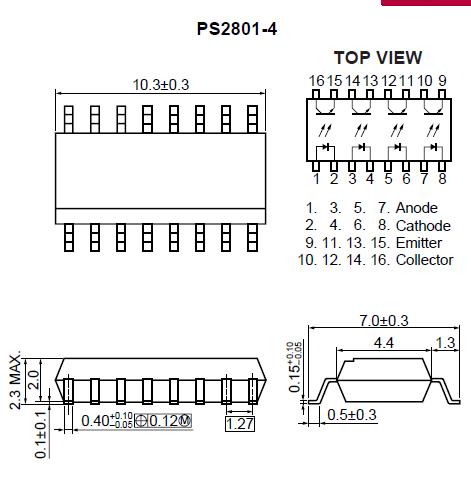 The PS2801-4 is an optically coupled isolator containing a GaAs light emitting diode and an NPN silicon phototransistor in a plastic SOP for high density applications. This package has shield effect to cut off ambient light. The applications of the PS2801-4 include Programmable logic controllers, Measuring instruments, Power supply, Hybrid IC.